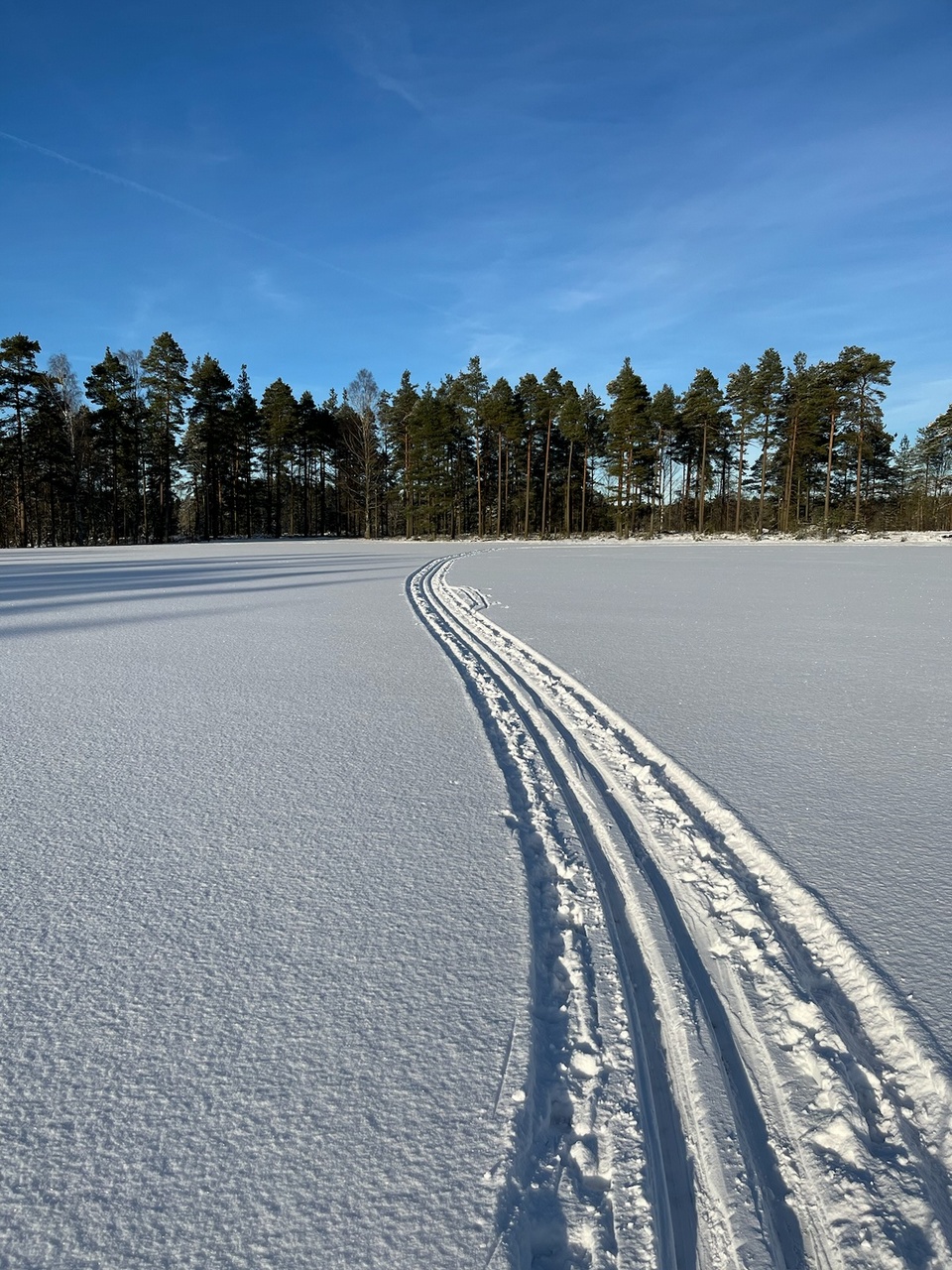Vinterbild med skidspår på frusen sjö och skogen i bakgrunden