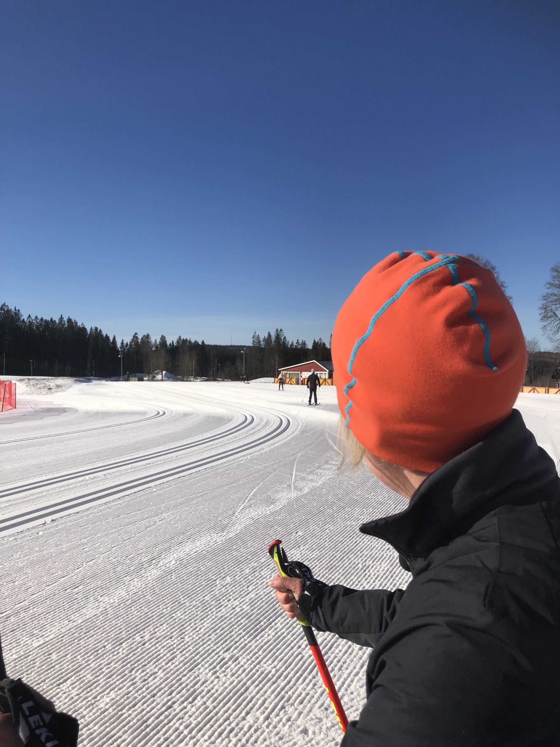 Kvinna i färd med att sträcka ut i perfekt preparerade längdspåren en solig vinterdag i bakgrunden fler skidåkare och spår som leder in i skogen