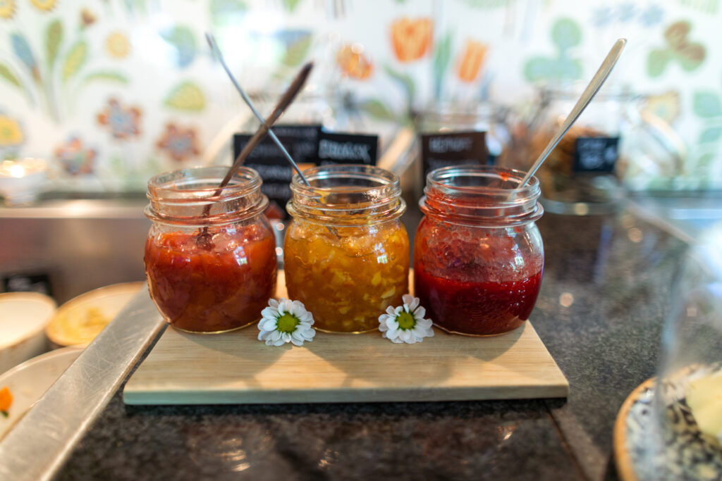 Buffeten indeholder frisk frugt, hjemmebagt brød, hjemmelavet müsli, marmelader, charcuteri, oste, Brittas sild, bacon, røræg, kogte æg, smoothies og meget mere.