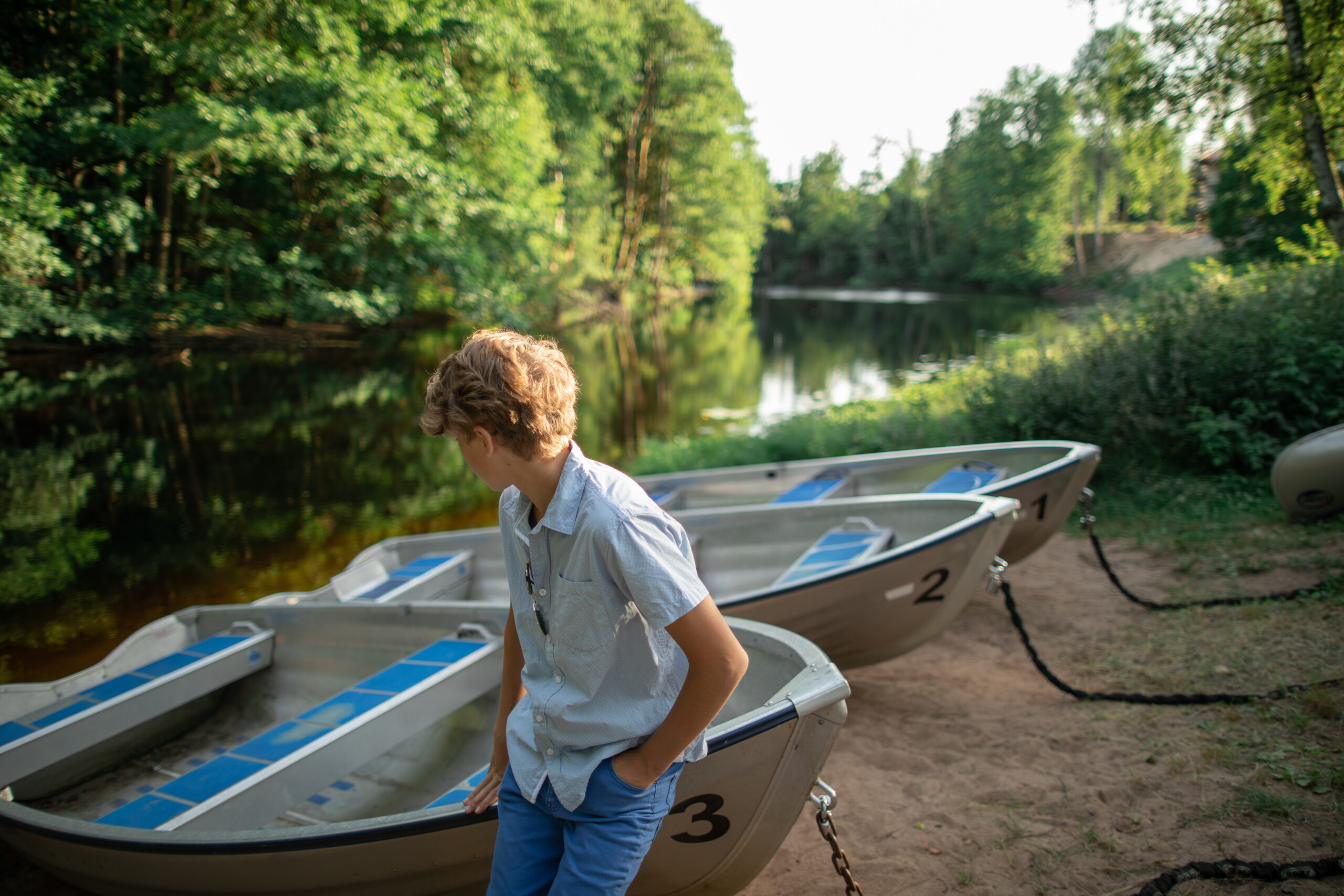 Kille vid roddbåtar på Hestraviken hotell vid Isaberg, blickar ut över Nissan och omgivningarna – en perfekt plats för äventyr och avkoppling.